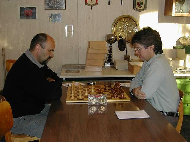 Besonders spannend wurde es für die Zuschauer im wie immer gut besuchten Vereinsheim, nachdem die reguläre Partie (hier zum Nachspielen) Remis geendet hatte (Matthias hatte 12. ... Sf2 ausgelassen, was ihm wohl eine deutlich bessere Stellung beschert hätte). Denn nun mussten drei Blitzpartien über den Turniersieg entscheiden. Detlev Kuhne konnte diese dank seiner sehr schnellen Hand mit 2,5 : 0,5 für sich entscheiden. Das Finale wurde im Nahschach ausgetragen, nachdem die Finalisten in einem E-Mail-Turnier ermittelt worden waren.
