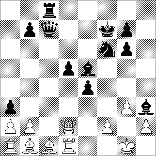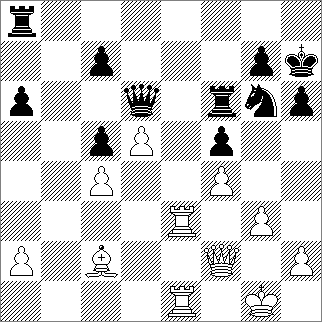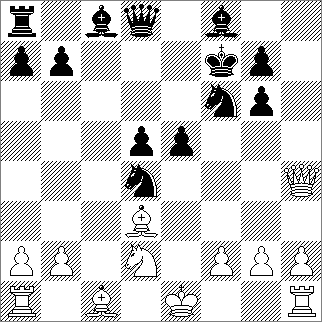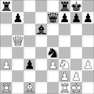 15.00?! Häufig gespielt wird 15.Sf3 Sxf3 16.gxf3 Lf5 17.Lxf5 gxf5 18.Lg5 mit ausgeglichenen Chancen. 15...e4 16.Lb1? Danach kommt Weiß nicht mehr zur Entwicklung seines Damenflügels. Besser ist 16.Lxe4 dxe4 17.Sxe4 oder 16.Sxe4 dxe4 17.Lxe4 in beiden Fällen mit besserem Spiel für Schwarz, jedoch ist die Remisgrenze noch nicht überschritten. 16...Ld6 16...Le7 (droht Sh5) 17.f3 (17.f4? Se2 18.Kh1 Sh5 19.Df2 Shg3+) 17...Db6 18.Kh1 e3 19.Se4 (19.Sb3? Da6+) 19...dxe4 20.Lxe3 Dxb2 21.Lxe4 Sf5 22.Df2 De5 mit schwarzem Vorteil. 17.Sb3 Sf5 17...Lxh2 Kh1 (18.Dxh2? Se2 19.Kh1 Sg4 20.Dh7 Df6+ oder Sh6+) 18...Le5 oder 18...Sxb3 19.axb3 Le5 mit schwarzem Vorteil. 18.Dg5 a5 18...Db6 19.Dd2 19.Td1 Db6 20.Le3 Sxe3 21.Dxe3 (21.fxe3 Lf5+ mit der Idee Th8, um Lh2 und Th5 zu drohen) 21...Lxh2+ 19...Dc7 20.g3 20.h3 Db6 20...a4 21.Sd4 Sxd4 21...Db6 22.Dxd4 Lh3 23.Td1 23.Te1 23...Le5 24.Dd2? 24.Db4 a3 25.Db3 Le6+ mit der Idee Sd7, b6, Dc1. Gut ist auch 25...Ta5 (mit der Idee Tc5) 26.Lxe4 Sxe4 27.Txd5 Le6 28.Df3 Sf6 29.Txa5 Dxa5 30.De2 Ld4+ mit der Drohung 31...Db6. Nach 25...Tc8? 26.Lxe4 kann Weiß versuchen, im Trüben zu fischen. 24...a3 25.Db4 Tc8 26.Dd2? 26.Dxa3 Dxc1 27.Lxe4 Dxb2 28.Dxb2 Lxb2 29.Tab1 Sxe4 30.Txb2 Tc7+