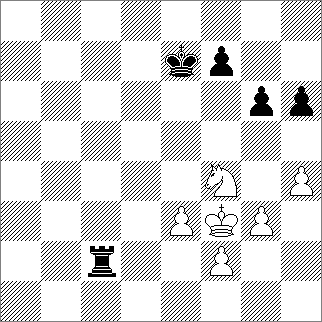 39.h5? Der Bh5 wird im Folgenden schwach. Das nun folgende Endspiel ist lehrreich und interessant. 39...g5 40.Sd3 f5 41.Se5? Der Abgabezug und der entscheidende Fehler. Nach 41.e4 kann Schwarz nicht gewinnen. 41...Tc1 42.g4 Auf 42.Sg6 folgt Ke6 43.Kg2 Kd5 44.Se7 Ke5 45.Sg6 Ke4. Schwarz plant f5-f4, was er eventuell mit Tc1c2 vorbereitet. 42...Ke6 43.Sg6 Tc4 44.gxf5 Kxf5 45.Se7 Kf6 46.Sg8 Kg7 47.Se7 g4 48.Kg3 Kf6 49.Sd5 Kg5 50.Sf4 Tc6! Schwarz will Se6 verhindern. Weiß hält remis nach z.B. 50...Tc2 51.Se6 Kxh5 52.Sf4 Kg5 53.Se6 Kf5 54.Sf4 usw. 51.Sd3 Tb6 52.Sf4 Ta6 53.Kg2 Auf 53.f3 gewinnt gxf3 54.Kxf3 Ta4 55.Kg3 Tc4 56.Kf3 Kh4. 53...Kh4 54.Kf1 Ta1 55.Ke2 Ta2 56.Ke1 g3 57.fxg3 Kxg3 58.Sd5 Kg4 59.Sf6 Kg5 01