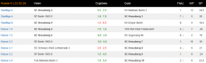 SCK2 ist weiter voll auf Kurs in Richtung Landesliga. Erneut ein deutlicher und überzeugender Sieg und dabei die Tabellenführung ausgebaut. SCK3 holt einen MP gegen TSG3 und behauptet sich knapp vor den Abstiegsplätzen. Das Ligaorakel tendiert klar pro Klassenerhalt. SCK4 spielt bockstark, gewinnt überraschend und holt wichtige Punkte gegen den Abstieg; kann damit die Abstiegsplätze aber leider nicht verlassen. SCK5 holt im Kampf auf Augenhöhe einen MP und bleibt im Tabellenmittelfeld jenseits von Aufstieg und Abstieg. SCK6 Das sehr junge Team war einmal mehr klarer Außenseiter und musste einmal mehr Lehrgeld bezahlen. Saure-Gurken-Zeit ohne MP. SCK7 gewinnt klar und bleibt knapp Tabellenführer nach Brettpunkten. SCK8 gewinnt klar und schiebt sich damit vom 3. auf den 2. Tabellenplatz, der aktuell ein Aufstiegsplatz wäre. SCK9 gewinnt klar und schiebt sich damit vom 3. auf den 1. Tabellenplatz. SCK10 gewinnt ebenfalls klar und behauptet den 4. Tabellenplatz. Mit nur einem MP Abstand zum Tabellenführer sollte hier noch alles drin sein.