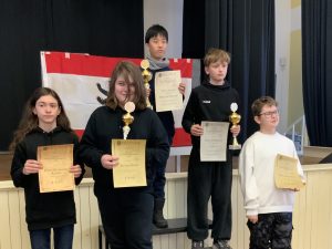 In der u10 waren wir sogar mit 2 Spielern am Start, die sich beide für die Deutsche Jugendmeisterschaft qualifiziert haben. Lukas Stanisic schaffte nach einer Schwächephase im Turnier doch noch, einen begehrten Pokal in Händen zu halten (Platz 3). Tymofii Malyi spielte ein gutes Turnier und schaffte trotz einer Niederlage in der letzten Runde gegen seinen Vereinskameraden Lukas, einen Qualifikationsplatz zu ergattern (4 Plätze in der U10).
