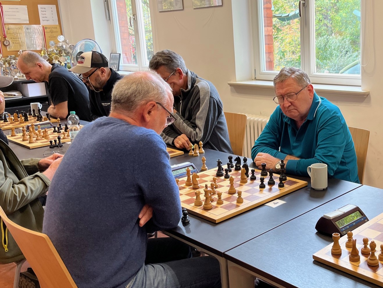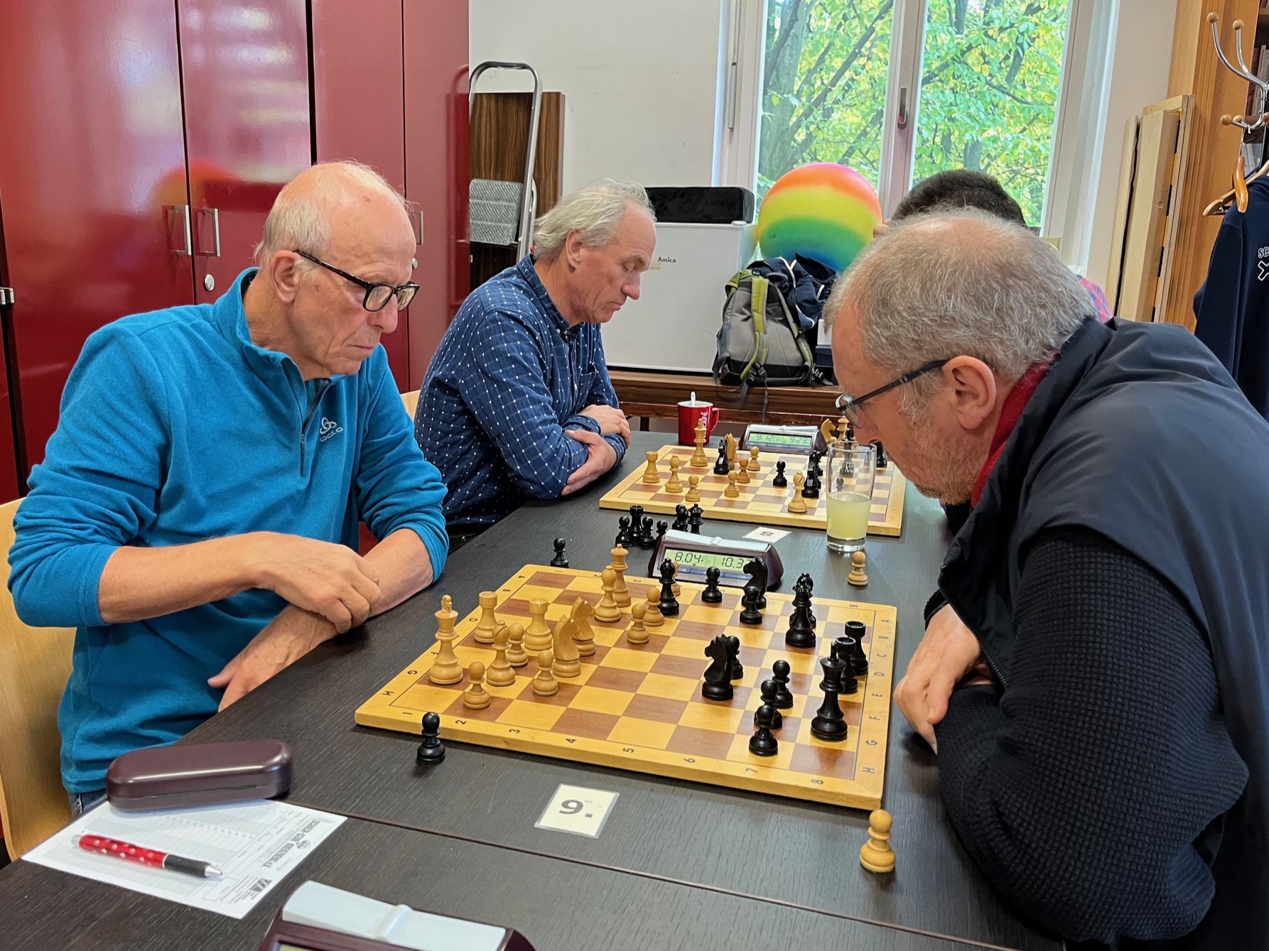 Nach Zug 40 waren die Aussichten sogar noch schöner: Aaron hatte an Brett 4 zwar eine Figur und seinen Vorteil verloren, kämpfte aber noch tapfer um das Remis. Auch wenn seine Bemühungen letztlich vergebens waren, hatten wir ansonsten inzwischen vielversprechende Stellungen auf dem Brett. Doch es war wie verflucht und eine Partie nach der anderen kippte: Freddy und Micha hatten mit Schwarz an Brettern 3 und 5 jeweils im Endspiel einen glatten Bauern mehr, konnten am Ende aber nur Remis sichern. Beide hatten auf Basis von Erinnerung (Freddy) und Vorbereitung (Micha) starke Eröffnungen gespielt, aber das letzte Quäntchen Glück war nicht auf unserer Seite. Das wäre normalerweise auch nicht nötig gewesen, da Julian und Constantin an Brettern 7 und 8 glatte Gewinnstellungen auf dem Brett hatten. Bei Julian dominierten seine Schwerfiguren und Freibauern in komplexer, offener Stellung das Brett, während Constantin sich in Seelenruhe 4 verbundene Freibauern gegen eine Figur rausgespielt hatte. Leider wurden aus Julians Matt in 11 und Constantins Abwicklung in ein gewonnenes Endspiel mit Mehrfigur nach jeweiligem Kollaps zwei Niederlagen, die den Endstand in ein 2,5:5,5 mit Mannschaftssieg für Tegel verwandelten. Manch einer unserer Spieler konnte es nicht fassen, denn selbst die Tegeler hatten zwischenzeitlich fast alle Hoffnungen fahren lassen. Da war mehr drin, und Sonntag warteten die mindestens ebenso gefährlichen Schachfreunde II.
