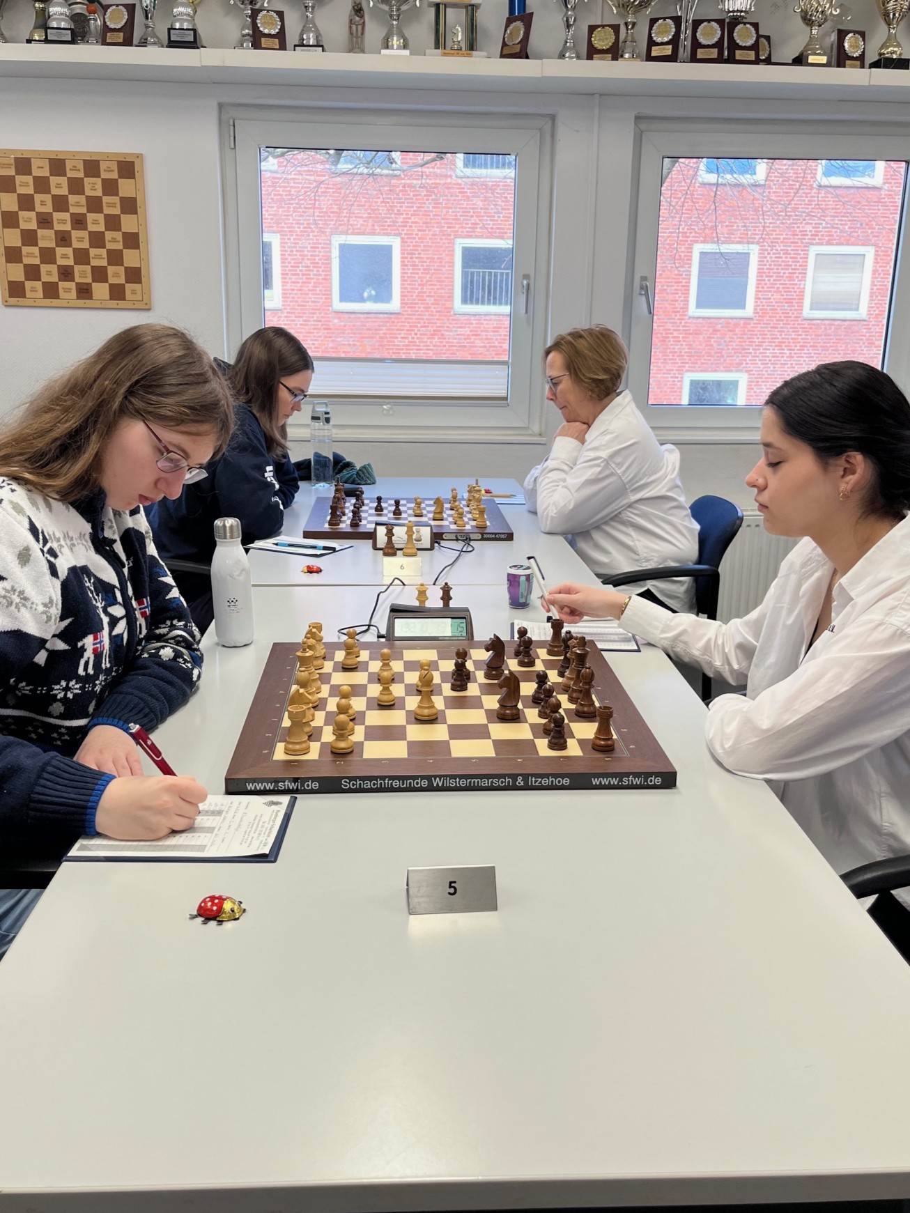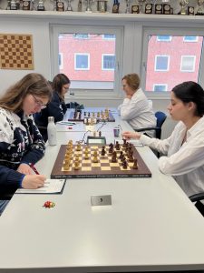 Am Sonntag mussten wir dann gegen den Tabellenführer SK Schwäbisch Hall antreten – dieses Mal war es Amina Fock, die wiederholt eine deutlich bessere Stellung gegen IM Meri Arabidze erspielen konnte. Auch Madiha Fock, Elnaz Bazzazi und wiederum Martina Skogvall standen lange ausgeglichen gegen die übermächtigen Gegnerinnen. Aber wie aus dem Ergebnis 0:6 zu entnehmen ist, konnte keine unserer Spielerinnen in dieser Runde einen Punkt erspielen.
