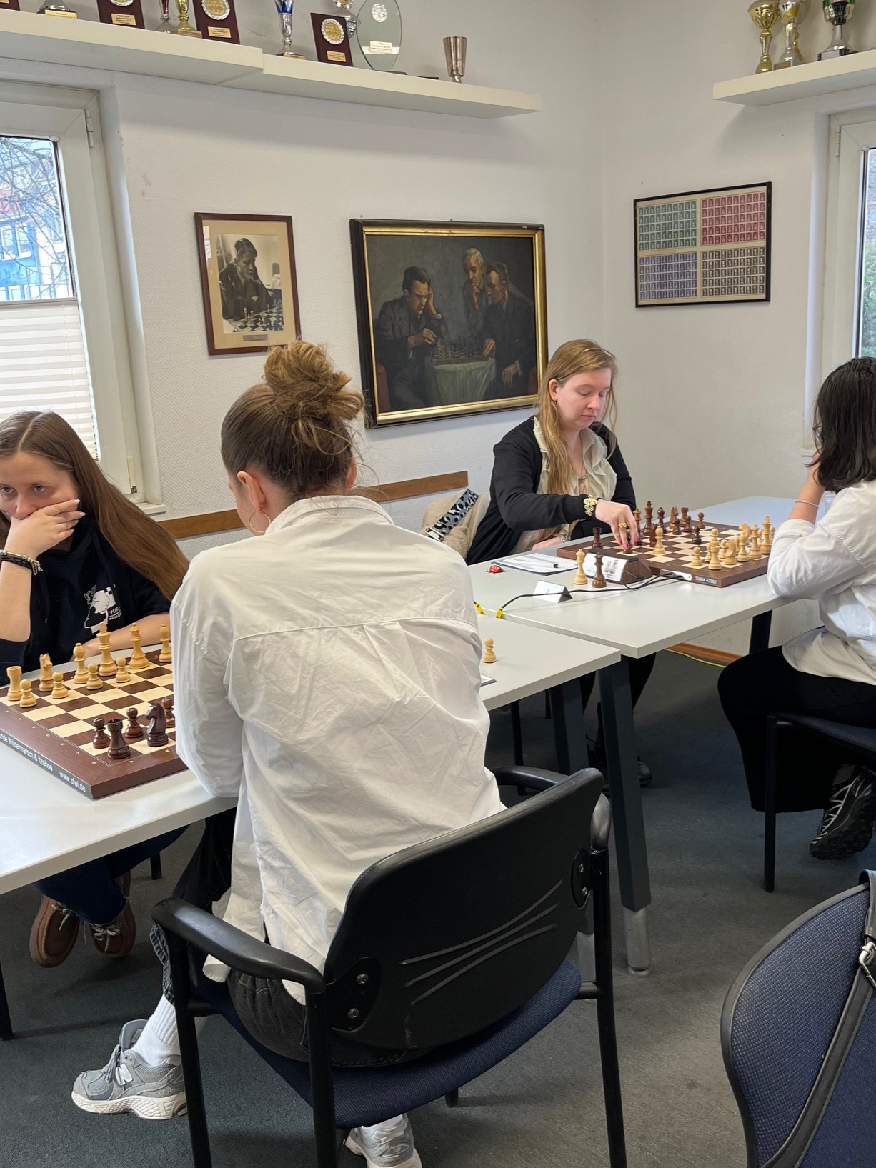 Wir hatten – leider erwartungsgemäß – nicht viel auszurichten gegen die beiden starken Frauenmannschaften von Deizisau und Schwäbisch Hall. Allerdings gab es doch kleine Hoffnungsschimmer gegen die beiden Mannschaft. Neben dem Sieg von Martina Skogvall gegen Felicitas Ophelia Carlstedt hatte auch Sana Fock eine vielversprechende Stellung gegen WGM Evgeniya Doluhanova auf dem Brett. Die Partien der Frauen-Bundesliga wurden übertragen und hier zu finden.