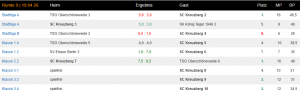 SCK2 setzt die Siegesserie fort und behält die weiße Weste. Damit ist der Aufstieg in die Landesliga nun auch rechnerisch abgesichert. Landesliga – Wir kommen! SCK3 hat sich trotz der Niederlage im Tabellenmittelfeld etabliert. Hier brennt nix mehr an. SCK4 gewinnt knapp mit einem starken Auftritt gegen WeDa3 und holt zwei ganz wichtige Mannschaftspunkte gegen den Abstieg. Gleichzeitig hat Abstiegskonkurrent Makabi im Fernduell hoch verloren. Das LigaOrakel schwenkt zugunsten von SCK4 von 89,2% auf nur noch 36,3% Abstiegswahrscheinlichkeit. Oder was einen Tick freundlicher klingt: schwenkt von 10,8% auf 63,7% Wahrscheinlichkeit pro Klassenerhalt. SCK5 verliert knapp gegen SG Weißensee und verbleibt im sicheren Mittelfeld der Tabelle. SCK6 punktet erneut und hat damit sogar vorzeitig den Klassenerhalt gesichert. Die Mannschaft startete mit 0 von 10 Mannschaftspunkten in die Saison und holte zuletzt 5 von 6 Mannschaftspunkten. Eine Story wie Phönix aus der Asche. Eine schöne Bestätigung für die junge Truppe, die in den Saisons davor zwei Mal direkt hintereinander aufgestiegen ist und sich nun in der 1. Stadtklasse etabliert. SCK7 siegt gegen SG Eckturm und steht vorzeitig als Aufsteiger fest. Der etwas unrühmliche Abstieg der letzten Saison ist damit repariert. SCK8 holt einen Kantersieg gegen Eckturm2 und ist wie SCK9 und SCK10 nach 8 Spieltagen schon mit der Saison durch. Ein vorläufiger 3. Platz ist ein gutes Ergebnis, aber der anvisierte Aufstieg wurde leider verfehlt. SCK9 gewinnt gegen Friedrichshagen3 und guckt sich die Tabelle von oben an. Obwohl die anderen Mannschaften in der Staffel noch ein Spiel austragen, reicht Platz 1 mit 3 MP Vorsprung vor dem Tabellendritten für den vorzeitigen Aufstieg. SCK10 holt einen glatten zu-Null-Sieg gegen TSG9. Die unmittelbaren Aufstiegskonkurrenten auf Platz 2 und 3 müssen am letzten Spieltag gegeneinander spielen und werden sich im direkten Duell gegenseitig die Punkte abnehmen, sodass maximal einer von beiden Konkurrenten an SCK10 vorbeiziehen kann. SCK10 steht daher ebenfalls vorzeitig als Aufsteiger fest.