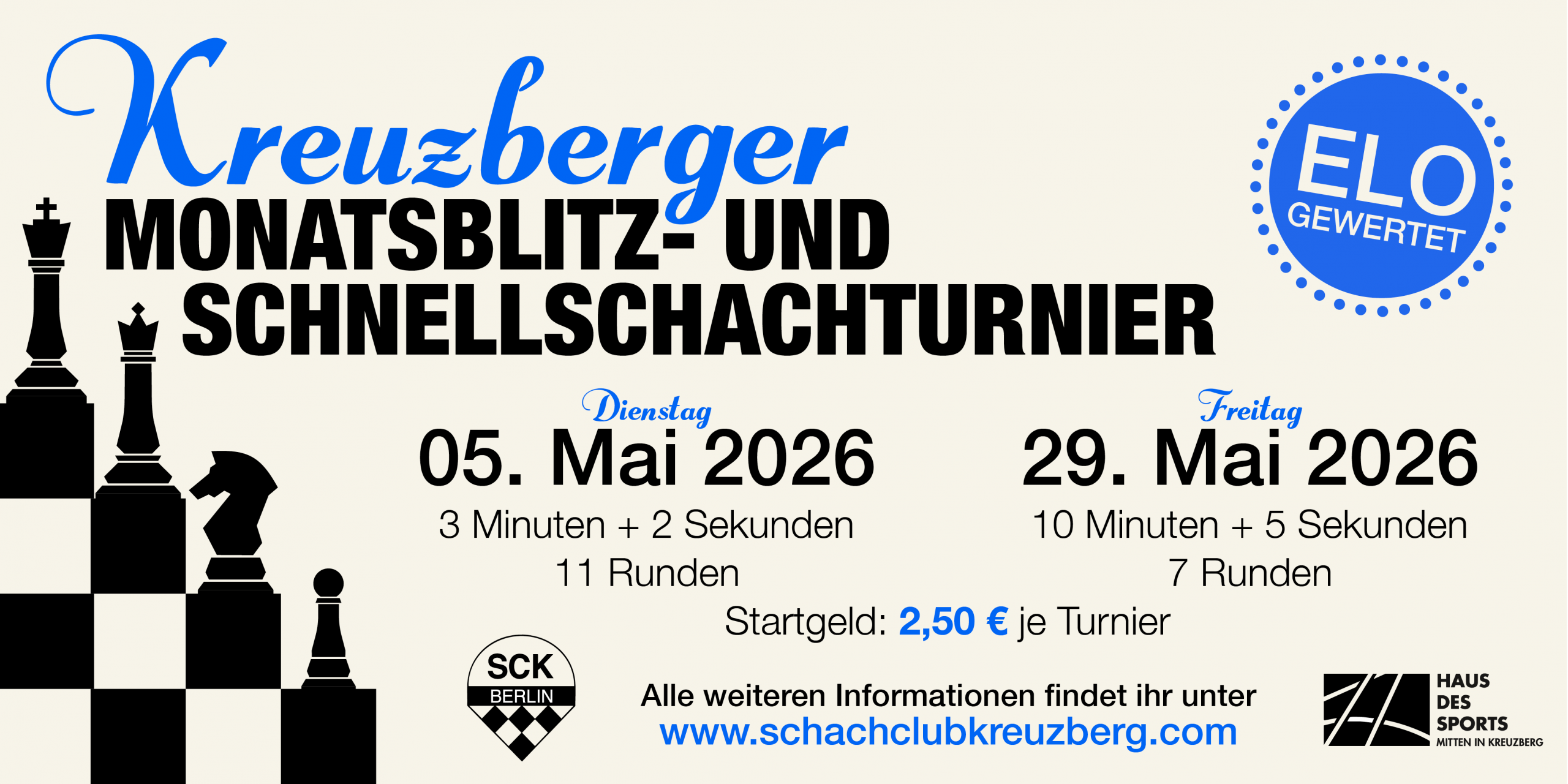 Mit insgesamt 7 Turnieren präsentieren wir in diesem Jahr den Kreuzberger Schachsommer 2026. Die Termine mussten wir wegen des Schachgipfels in Dresden (16. bis 26. Juli) entzerren. Daher beginnen das Werner-Ott-Open und das U25-Elo-Youngsters erst Anfang August. Das Kinderturnier und die weiteren Turniere finden zum Ferienbeginn statt.