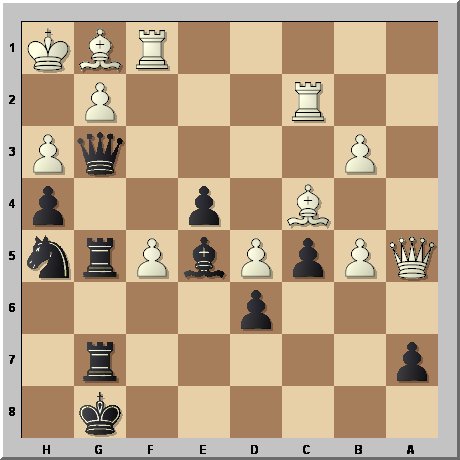 Links sieht alles nach einem vernichtenden Mattangriff aus. Wie kann Schwarz durchbrechen? (Im Anschluss werde ch die ganze Partie angeben, weil sie zahlreiche strategische Ideen aufzeigt).