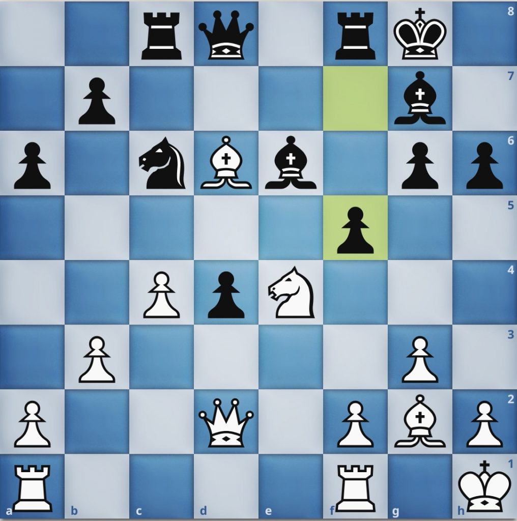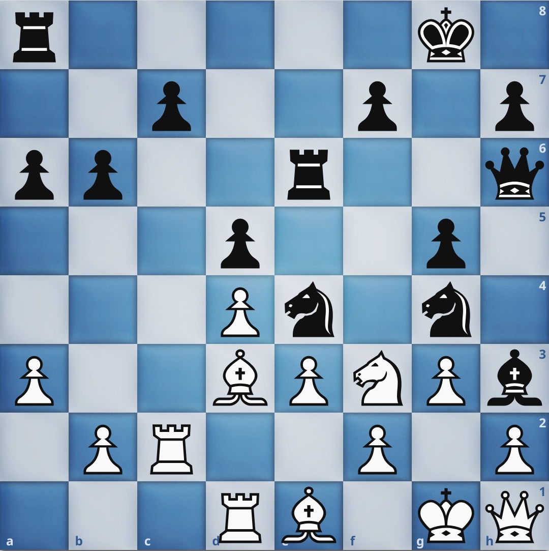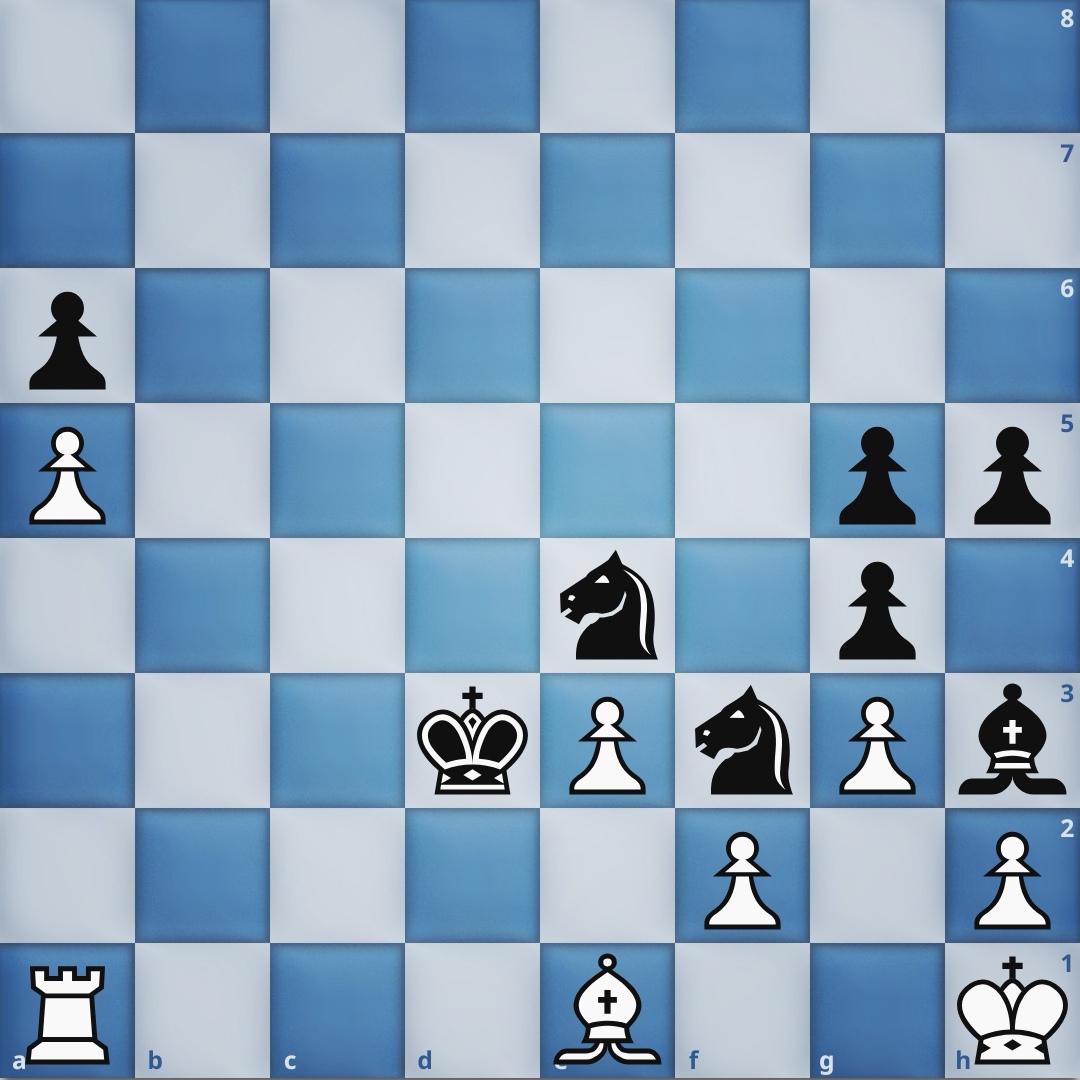 Apropos entspannt: Im Kampf gegen Weisse Dame zeichnete sich früh ab, dass wir unserer Favoritenrolle auch nachkommen würden. Die hinteren Bretter legten dabei gut vor. Max gewann an Brett 7 mit unkonventioneller Eröffnung und seinem typisch schnellen Spiel schon recht früh einen Bauern und nach Zeitnotpatzer seine Partie. Während sein Gegner vom Inkrement lebte, blitze Max mit über einer Stunde Bedenkzeit seine famosen Züge fröhlich bis zum Sieg runter. Julian investierte an Brett 8 etwas mehr Zeit und erreichte eine symmetrische Stellung, in der er jedoch mit Schwarz 2 volle Tempi mehr besaß. Diesen Vorteil wandelte er prompt in einen Bauern, Figurenspiel und ein engmaschiges Mattnetz um. Zeitgleich standen wir an fast allen anderen Brettern gut bis komplett gewonnen, den nächsten Punkt machte Aron an Brett 3 aber erst in der Zeitnotphase kurz vor Zug 40. Er hatte eine oberflächlich ruhige, positionell saubere, aber letztlich sehr taktische Partie mit vielen kleinen Feinheiten gespielt (siehe Diagramm). Mit geschwächtem König und schlechteren Figuren sah sein Gegner in akuter Zeitnot seine letzte Chance in einem hochspekulativen Turmopfer, das den weißen König freilegte, jedoch Aron überhaupt nicht aus der Ruhe brachte. Zur Zeitkontrolle stand es damit 3:0. Als Freddy dann an Brett 4 seine etwas missglückte Eröffnung durch aktives Spiel im Endspiel zum Remis rettete, löste er damit auch die einzige Stellung auf, in der wir überhaupt deutlich schlechter standen. Aaron konnte an Brett 5 aus seiner Eröffnung keinen substanziellen Vorteil gewinnen und war nach einer geschickten Abwicklung seines Gegners in ein elementares Turmendspiel mit seinem schnell folgenden Remis nicht völlig unzufrieden.