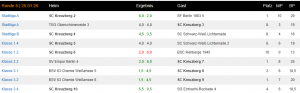 SCK2 ist weiter voll auf Kurs in Richtung Landesliga. Erneut ein deutlicher und überzeugender Sieg und dabei die Tabellenführung ausgebaut. SCK3 holt einen MP gegen TSG3 und behauptet sich knapp vor den Abstiegsplätzen. Das Ligaorakel tendiert klar pro Klassenerhalt. SCK4 spielt bockstark, gewinnt überraschend und holt wichtige Punkte gegen den Abstieg; kann damit die Abstiegsplätze aber leider nicht verlassen. SCK5 holt im Kampf auf Augenhöhe einen MP und bleibt im Tabellenmittelfeld jenseits von Aufstieg und Abstieg. SCK6 Das sehr junge Team war einmal mehr klarer Außenseiter und musste einmal mehr Lehrgeld bezahlen. Saure-Gurken-Zeit ohne MP. SCK7 gewinnt klar und bleibt knapp Tabellenführer nach Brettpunkten. SCK8 gewinnt klar und schiebt sich damit vom 3. auf den 2. Tabellenplatz, der aktuell ein Aufstiegsplatz wäre. SCK9 gewinnt klar und schiebt sich damit vom 3. auf den 1. Tabellenplatz. SCK10 gewinnt ebenfalls klar und behauptet den 4. Tabellenplatz. Mit nur einem MP Abstand zum Tabellenführer sollte hier noch alles drin sein.