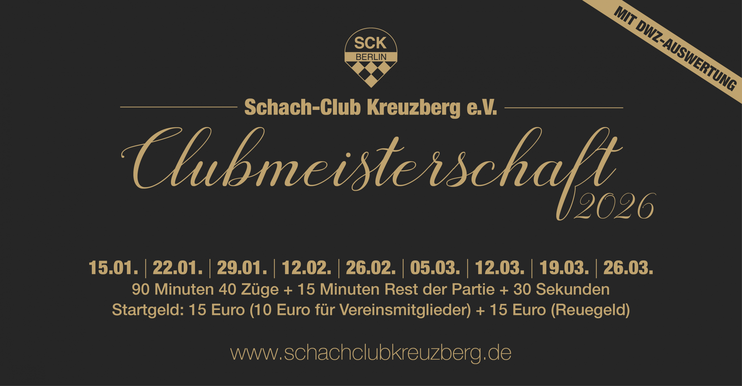 Auch 2026 findet wieder unsere traditionelle Clubmeisterschaft in Kreuzberg statt. Gespielt wird um den offiziellen Titel “Clubmeisters 2026” und ein Gesamtpreisfond von 550 Euro. Die Clubmeisterschaft wird wieder als offenes Turnier ausgerichtet. Wir freuen uns auf eine rege Teilnahme. Die Anmeldung erfolgt über das Anmeldetool von Chess:Manager und dort seht ihr auch die stets aktuelle Teilnehmerliste.