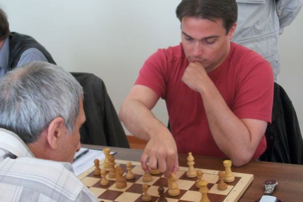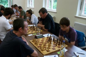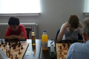 Etwas remisträchtiger ging es im erweiterten Favoritenfeld zu. Unter anderem einigten sich Rainer Albrecht und Ronny Gaerths auf ein recht schnelles Remis, die im Bild bei guter Stimmung ihre Partie untersuchten. Offenbar brauchte Ronny eine kleine Verschnaufpause, nachdem er am Vorabend von Jakob Meister im Damenendspiel geknetet wurde?!