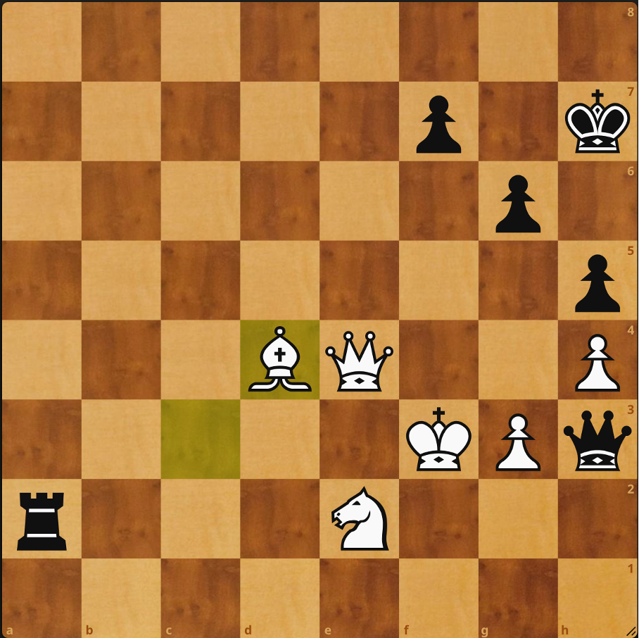 Am unteren Brett 8 gewann Constantin mit Weiß dank großen Raumvorteils und überzeugendem Qualitätsopfer pünktlich zu Zug 40 seine Partie (siehe Diagramm). Ebenfalls zur Zeitkontrolle hatte Freddy auf einmal eine Mehrfigur gegen 3 Bauern auf dem Brett. Sein langfristiges Bauernopfer in der Eröffnung machte sich bezahlt, und er gewann das Endspiel mit Dame, Springer und fortgeschrittenem Freibauern schnell. Beim Stand von 4:3 wandten sich alle Blicke zu Aaron, der mit Schwarz in der Eröffnung etwas unter Druck stand, aber später komfortabel ausglich. Leider vertat er sich im entstehenden Endspiel mehrfach in Folge, was zum Verlust von 2 Bauern und nach zäher Verteidigung zur Niederlage führte. Der Endstand 4:4 gegen starke Görlitzer ist kein schlechtes Ergebnis, aber da war mehr drin.