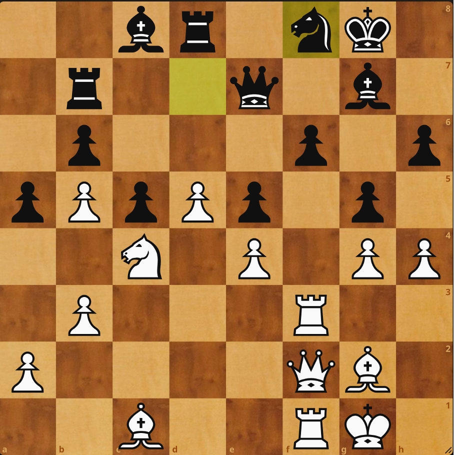 IM Szelag – FM Tschernatsch, Schwarz am Zug: Viele Wege führen nach Rom, aber Johannes machte mit 1. … Dh1+, 2. … Dxe4+ und 3. … Txe2+ nach einer langen Partie wohlverdient den Sack zu.