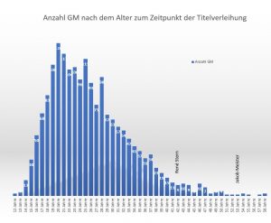 Wie selten der GM-Titel im Alter 40+ oder gar 50+ verliehen wird, zeigt die Grafik. Darunter sind sogar die bekannten Berliner GM René Stern und Jakob Meister. Also richtig seltene Exemplare nach dieser Rechnung.