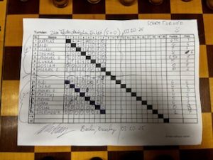 8 Blitzer haben sich zum Blitzen getroffen. Spontan, 5min ohne Inkrement im Rutschsystem mit Handzettel. Und weil eine Runde nicht reichte, wurde gleich doppelrundig gespielt. Wegen grenzwertiger Lesbarkeit: Gewonnen hat Lukka Mayer mit (13/14) vor Micha Ziems (11/14), Matze Bolk (10,5/14) und Albi Canaj (8/14).